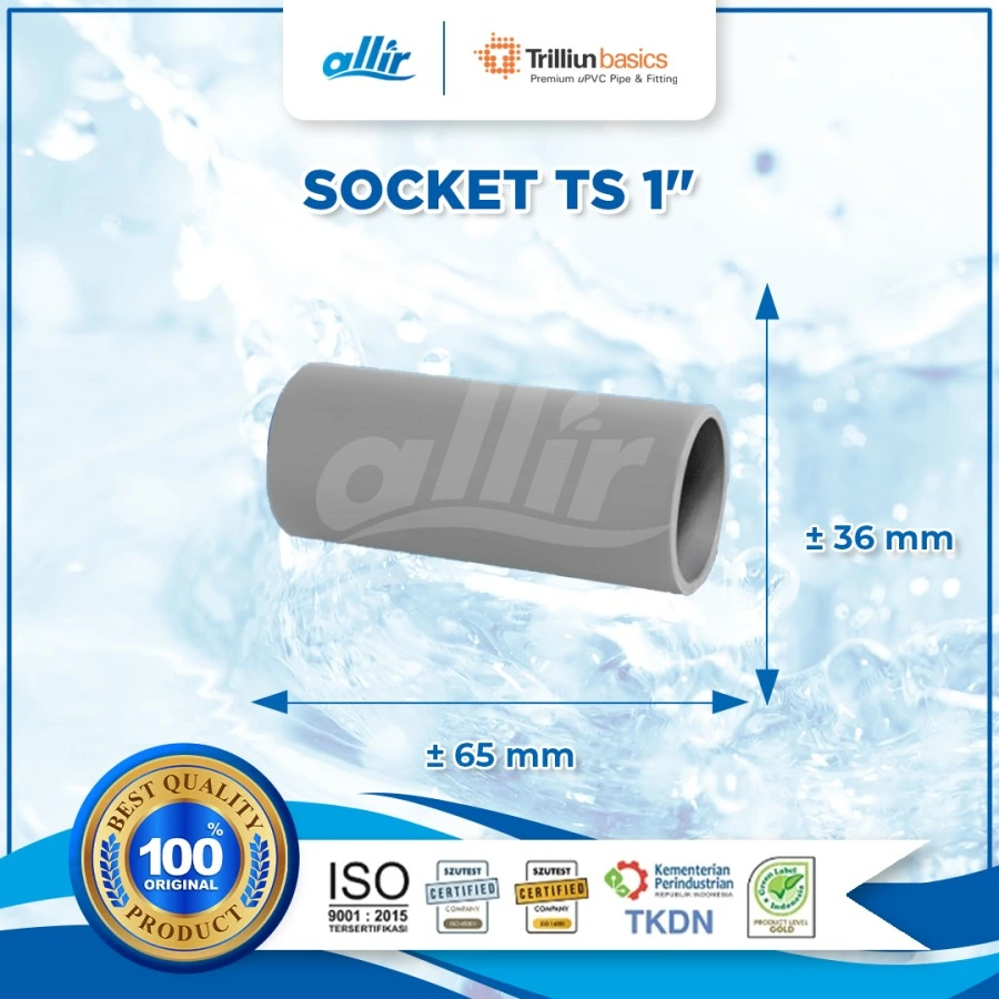 Trilliunbasics: Fitting uPVC Premium Fitting uPVC Trilliunbasics merupakan produk berkualitas tinggi dari Trilliun sebagai upaya dalam memenuhi kebutuhan pelanggan yang beragam dalam hal instalasi perpipaan dan menjadi solusi dalam memenuhi kebutuhan perpipaan. Spesifikasi Produk : TS Socket - Ukuran 1" Keunggulan : - Kuat dan tahan lama - Bersifat insulator - Tahan korosi - Tahan bahan kimia - Tahan api - Tahan terhadap pertumbuhan bakteri - Diproses mengunakan mesin & teknologi Eropa - Dikerjakan oleh tenaga ahli & teknisi profesional yang sangat berpengalaman Aplikasi Sistem : - Saluran air bersih - Saluran pembuangan dan limbah - Saluran irigasi - Pipa ventilasi - Pelindung kabel listrik Fitting uPVC Trilliunbasics telah memenuhi standar ISO 9001:2015, ISO 45001:2018 (OHSAS) dan ISO 14001:2015 (OHSAS) dalam proses produksinya. Selain itu Fitting uPVC Trilliunbasics telah mendapat sertifikat Green Label (Gold) dari badan Green Label Council Indonesia, sehingga membuktikan Fitting uPVC Trilliunbasics telah terbukti sebagai fitting berkualitas dan telah melewati standar uji yang tinggi.