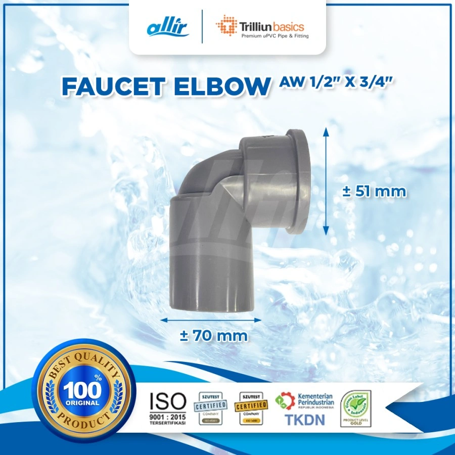 Trilliunpureflo: Fitting uPVC Premium & Bebas Timbal Fitting uPVC Trilliunpureflo merupakan produk premium dari Trilliun untuk memenuhi permintaan pasar dalam penyediaan fitting yang dengan kualitas terbaik untuk solusi segala kebutuhan instalasi perpipaan. Fitting uPVC Trilliunpureflo dibuat dari bahan baku berkualitas tinggi dan murni, sehingga menghasilkan karakter fitting uPVC yang kuat, tidak mudah pecah dan tahan lama. Karakter ini merupakan standar kualitas andalan dari Fitting uPVC Trilliunpureflo. Spesifikasi Produk : AW Faucet Elbow- Ukuran 1/2" x 3/4" Keunggulan : - Kuat, tidak mudah pecah dan tahan lama - Aman untuk saluran air minum - Bebas timbal (Lead-Free) - Bebas racun (Non Toxic) - Elastis & fleksibel - Bersifat insulator - Tahan korosi - Tahan bahan kimia - Tahan api - Tahan terhadap pertumbuhan bakteri - Diproses mengunakan mesin & teknologi Eropa - Dikerjakan oleh tenaga ahli & teknisi profesional yang sangat berpengalaman Aplikasi Sistem : - Saluran air bersih dan air minum - Saluran pembuangan dan limbah - Saluran irigasi - Pipa ventilasi Melalui pengujian yang sangat ketat oleh NSF, Fitting uPVC Trilliunpureflo terbukti telah bebas timbal serta bebas racun sehingga sangat baik untuk digunakan untuk saluran air bersih serta pembuangan air di perumahan, perkantoran, proyek komersial serta industi yang membutuhkan spesifikasi tinggi.