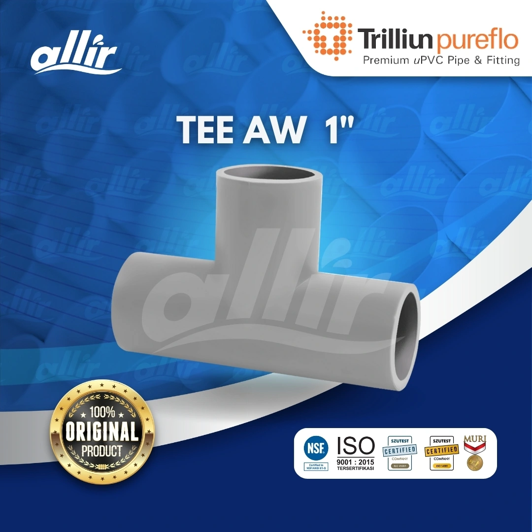 Trilliunpureflo: Fitting uPVC Premium & Bebas Timbal Fitting uPVC Trilliunpureflo merupakan produk premium dari Trilliun untuk memenuhi permintaan pasar dalam penyediaan fitting yang dengan kualitas terbaik untuk solusi segala kebutuhan instalasi perpipaan. Fitting uPVC Trilliunpureflo dibuat dari bahan baku berkualitas tinggi dan murni, sehingga menghasilkan karakter fitting uPVC yang kuat, tidak mudah pecah dan tahan lama. Karakter ini merupakan standar kualitas andalan dari Fitting uPVC Trilliunpureflo. Spesifikasi Produk : AW Tee - Ukuran 1" Keunggulan : - Kuat, tidak mudah pecah dan tahan lama - Aman untuk saluran air minum - Bebas timbal (Lead-Free) - Bebas racun (Non Toxic) - Elastis & fleksibel - Bersifat insulator - Tahan korosi - Tahan bahan kimia - Tahan api - Tahan terhadap pertumbuhan bakteri - Diproses mengunakan mesin & teknologi Eropa - Dikerjakan oleh tenaga ahli & teknisi profesional yang sangat berpengalaman Aplikasi Sistem : - Saluran air bersih dan air minum - Saluran pembuangan dan limbah - Saluran irigasi - Pipa ventilasi Melalui pengujian yang sangat ketat oleh NSF, Fitting uPVC Trilliunpureflo terbukti telah bebas timbal serta bebas racun sehingga sangat baik untuk digunakan untuk saluran air bersih serta pembuangan air di perumahan, perkantoran, proyek komersial serta industi yang membutuhkan spesifikasi tinggi.