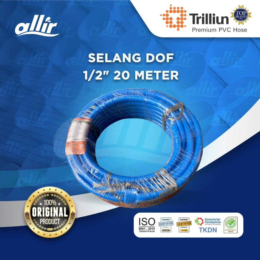 Selang Air PVC Trilliun Dof Selang PVC Trilliun Dof adalah selang multifungsi yang terbuat dari bahan PVC kualitas terbaik yang dapat digunakan di segala macam kebutuhan umum. Selang PVC Trilliun Dof sangat fleksibel dan memiliki ketahanan serta kekuatan yang tinggi. Selang PVC Trilliun Dof tersedia dalam warna biru. Spesifikasi Produk : - Ukuran 1/2"" - Panjang 20 meter Keunggulan Produk : - Terbuat dari 100% bahan baku PVC Murni - Kuat dan tahan lama - Multifungsi - Lembut - Elastis - Fleksibel - Aman dan bersih Aplikasi Sistem : - Untuk kebutuhan rumah tangga seperti penyaluran air, penyiraman kebun, pembersihan lantai garasi dan lain-lain. - Baik untuk digunakan dalam peternakan, perikanan, pertanian dan tempat-tempat umum seperti sekolah, rumah sakit, hotel dan lain-lain. -Tahan lama dalam pengaliran air yang bertekanan rendah untuk semua kebutuhan umum.