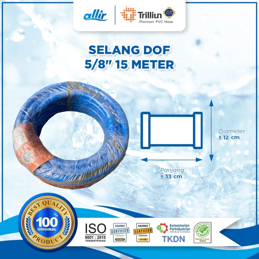 Selang Air PVC Trilliun Dof Selang PVC Trilliun Dof adalah selang multifungsi yang terbuat dari bahan PVC kualitas terbaik yang dapat digunakan di segala macam kebutuhan umum. Selang PVC Trilliun Dof sangat fleksibel dan memiliki ketahanan serta kekuatan yang tinggi. Selang PVC Trilliun Dof tersedia dalam warna biru. Spesifikasi Produk : - Ukuran 5/8"" - Panjang 15 meter Keunggulan Produk : - Terbuat dari 100% bahan baku PVC Murni - Kuat dan tahan lama - Multifungsi - Lembut - Elastis - Fleksibel - Aman dan bersih Aplikasi Sistem : - Untuk kebutuhan rumah tangga seperti penyaluran air, penyiraman kebun, pembersihan lantai garasi dan lain-lain. - Baik untuk digunakan dalam peternakan, perikanan, pertanian dan tempat-tempat umum seperti sekolah, rumah sakit, hotel dan lain-lain. -Tahan lama dalam pengaliran air yang bertekanan rendah untuk semua kebutuhan umum.